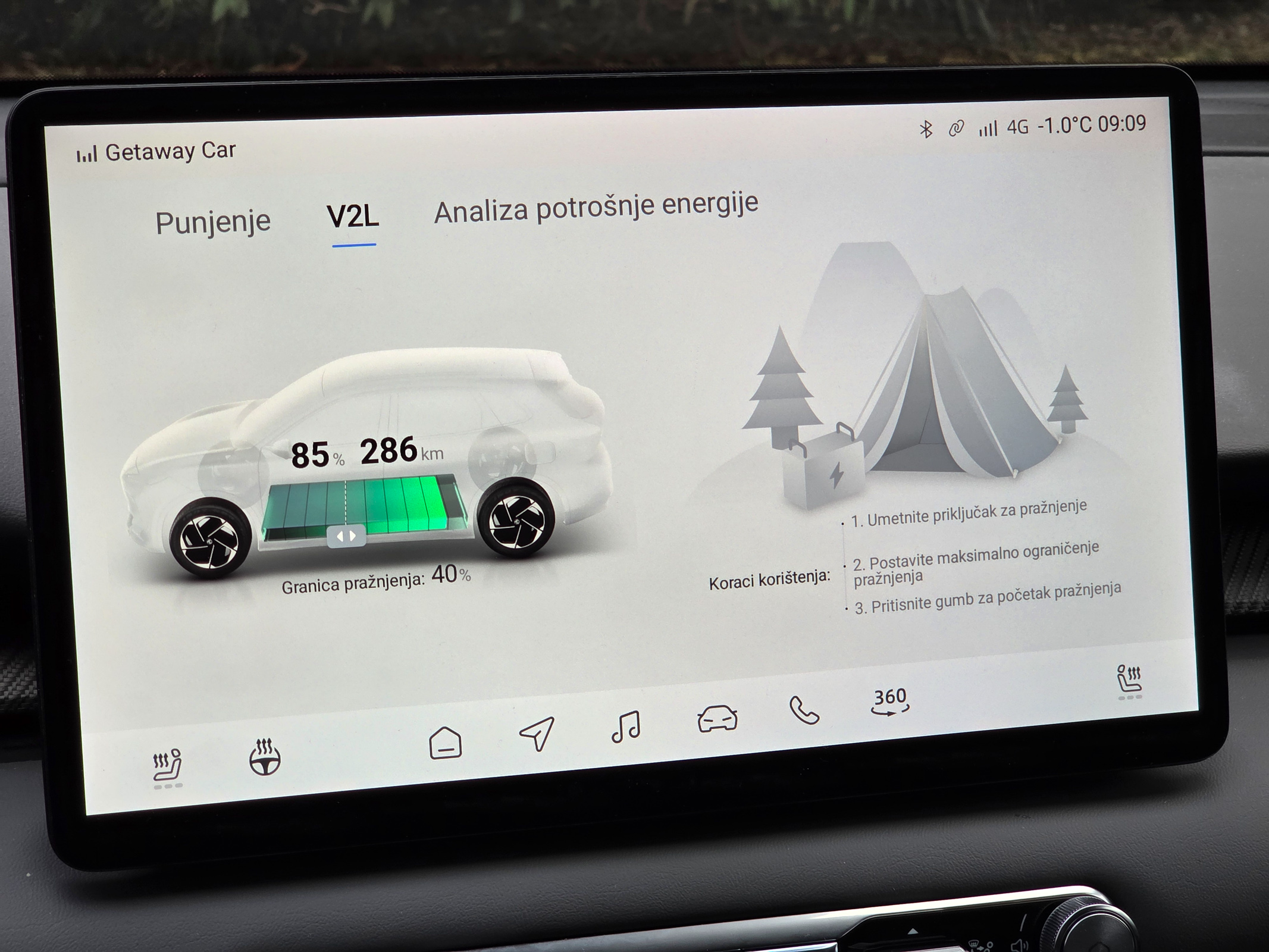 Zaslon ima rezervirano dno za prikaz osnovnih kratica, od početnog zaslona, navigacije, glazbe, postavki automobila, do brzog paljenja 360° kamere.